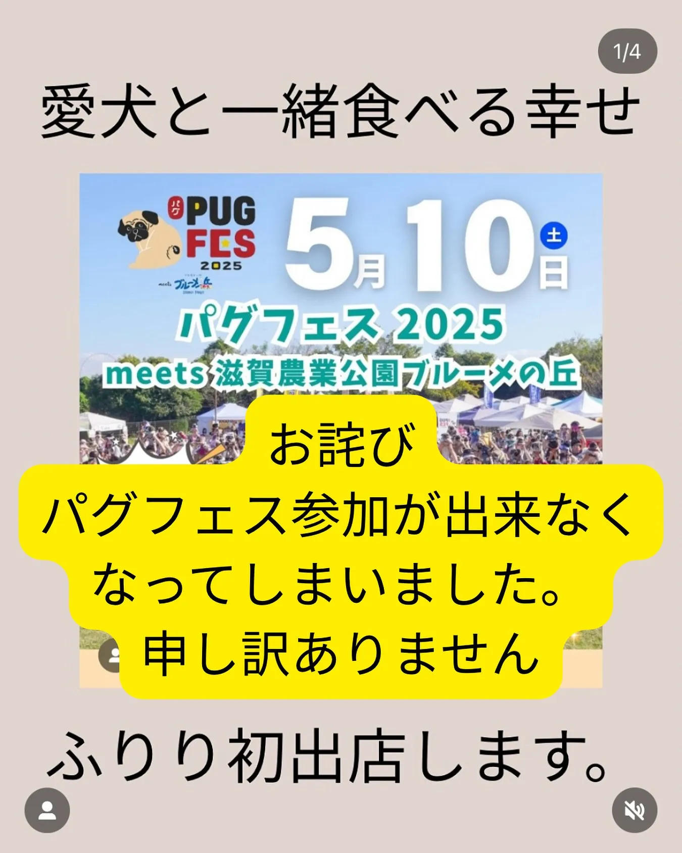このたび、出店を予定していた《パグフェス2025 in 滋賀農業公園ブルーメの丘》ですが、急なぎっくり腰により参加を見送らせていただくこととなりました。
